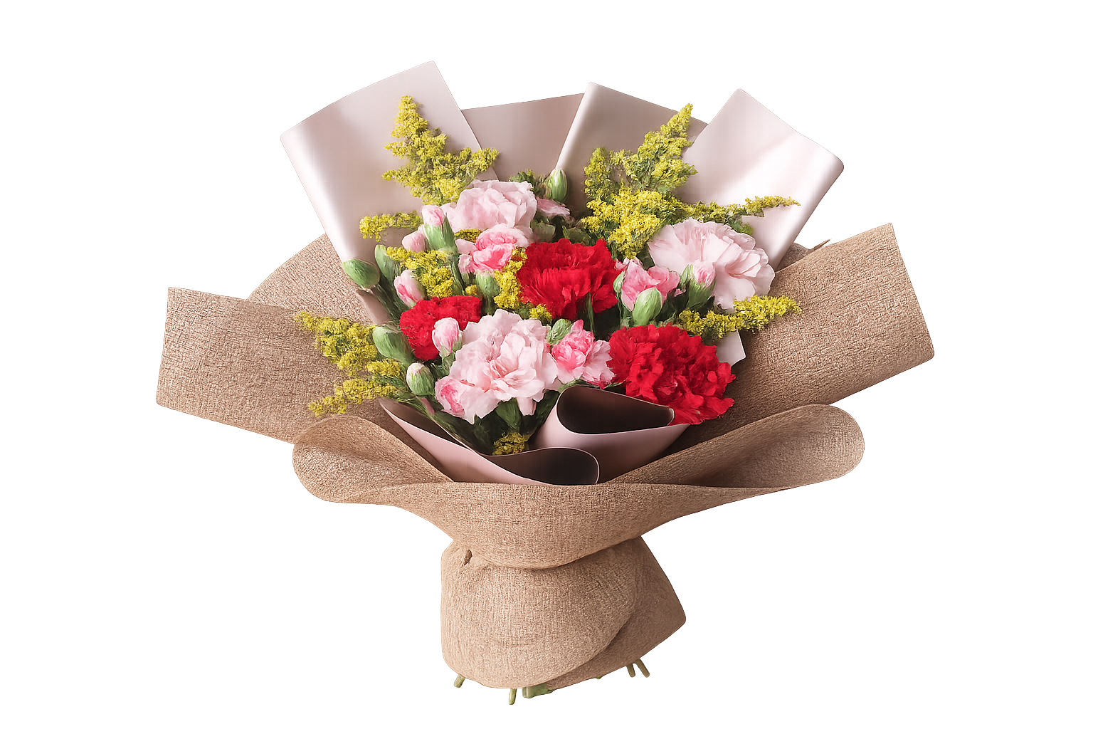 Refined and graceful, Madame Blush features romantic carnations in soft pink and deep red, complemented by golden floral touches and wrapped in luxurious rustic elegance. A sophisticated bouquet designed for the lady who deserves something truly special.