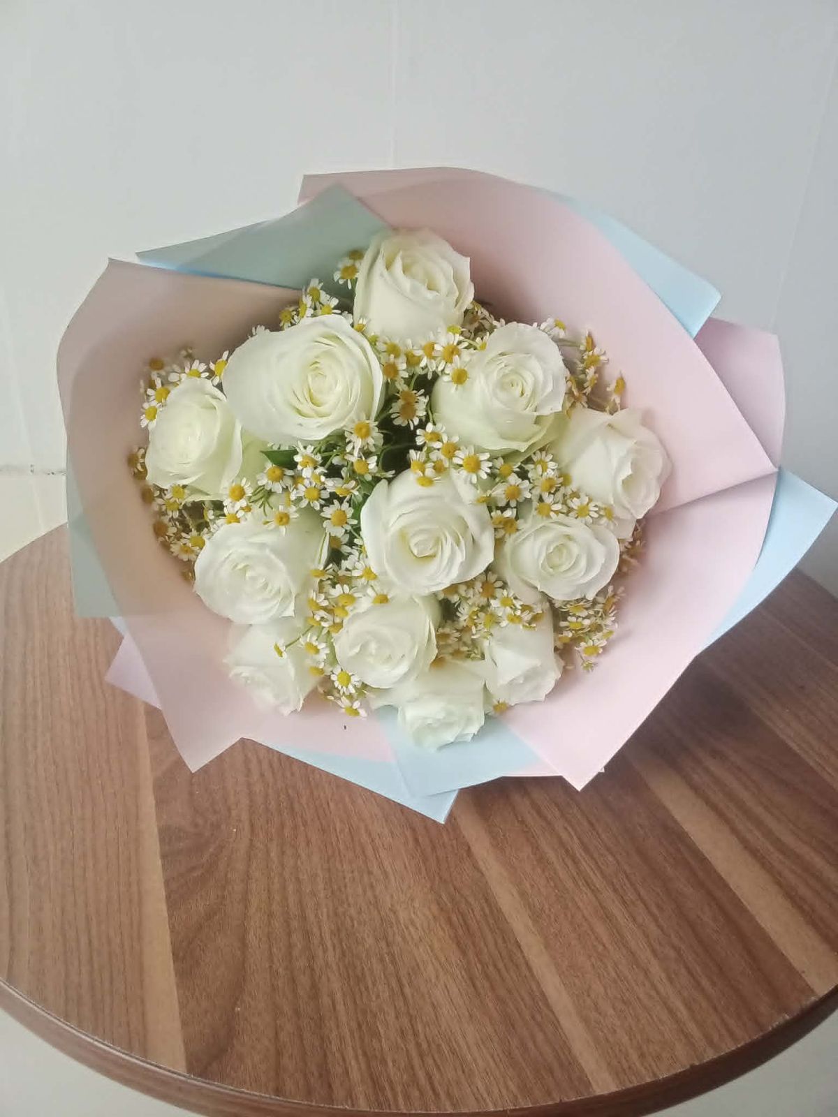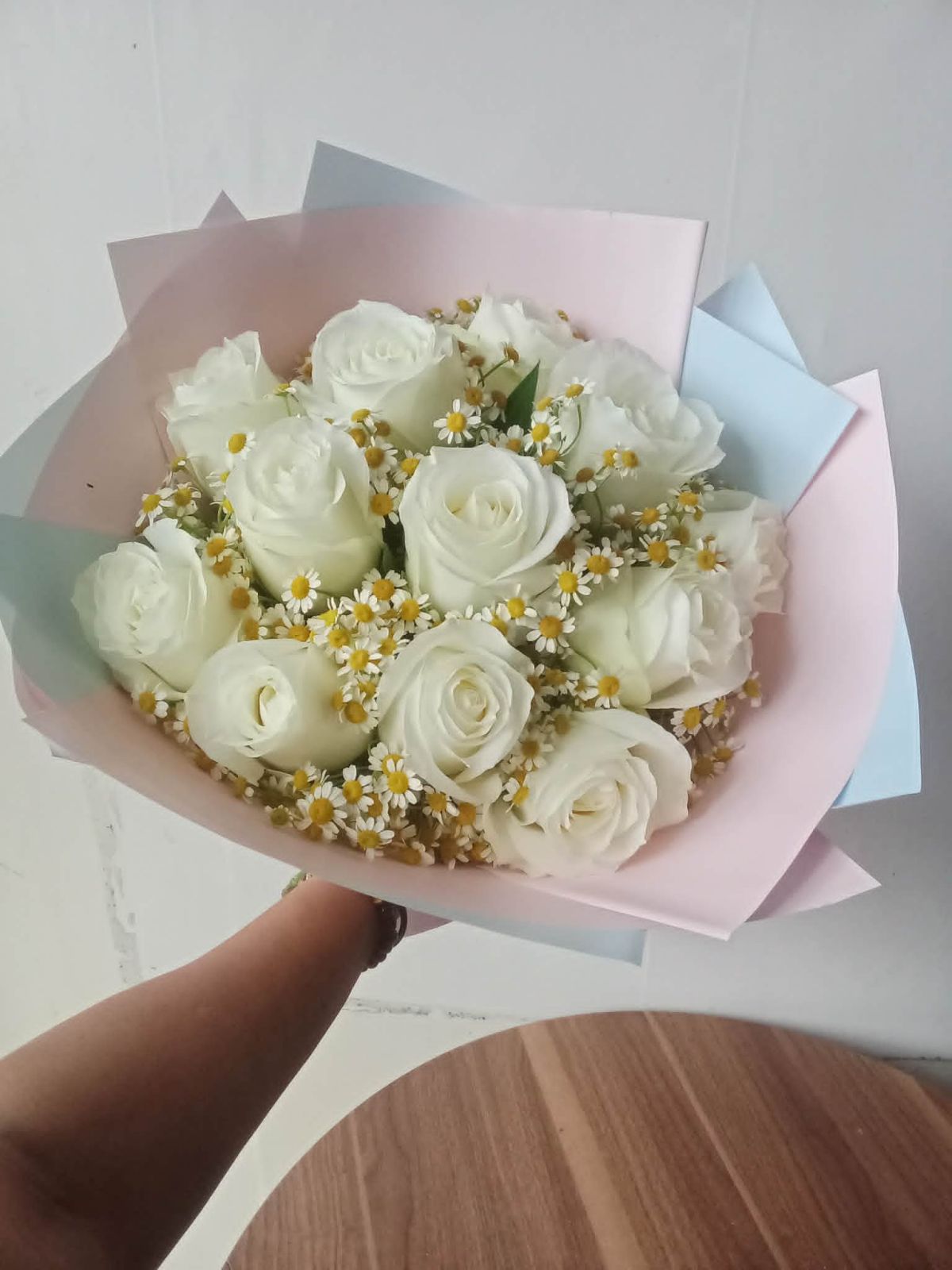 A timeless bouquet of pristine white roses, beautifully hand-tied and wrapped in soft white and cream tones. Each bloom is carefully selected for its elegance and purity, making this arrangement a graceful way to express your love, sympathy, or heartfelt wishes.