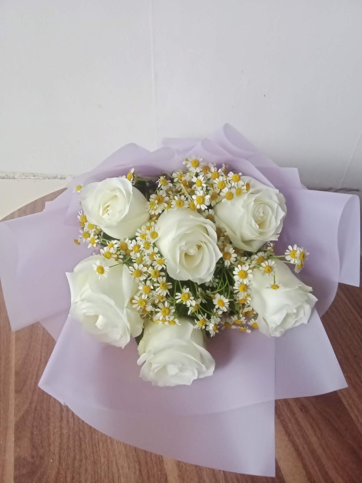 A timeless bouquet of pristine white roses, beautifully hand-tied and wrapped in soft white and cream tones. Each bloom is carefully selected for its elegance and purity, making this arrangement a graceful way to express your love, sympathy, or heartfelt wishes.